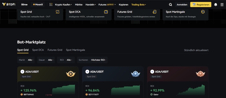Grid Bots kaufen und verkaufen in festgelegten Preisintervallen. Kurs fällt? Bot kauft nach. Kurs steigt? Gewinne werden mitgenommen. Diese Mechanik profitiert von der natürlichen Krypto-Volatilität. Plattformen wie BYDFi bieten dabei verschiedene vorkonfigurierte Bot-Strategien für unterschiedliche Marktbedingungen.