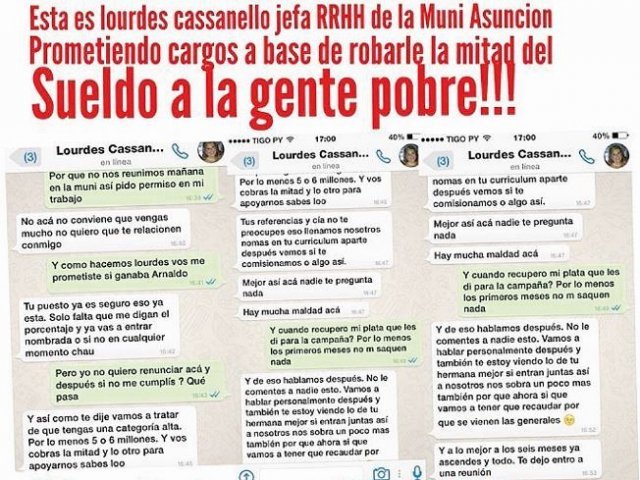 Eine vermeintliche Kommunikation zwischen der Personalchefin der Stadtverwaltung von Asunción und einer Bewerberin um einen Posten in der Institution machte dieser Tage die Runde in sozialen Netzwerken. Gemäß dem Dialog sollte die Stellenaspirantin die Hälfte ihres Gehaltes für die Wahlkampagne des aktuellen Bürgermeisters abgegeben.