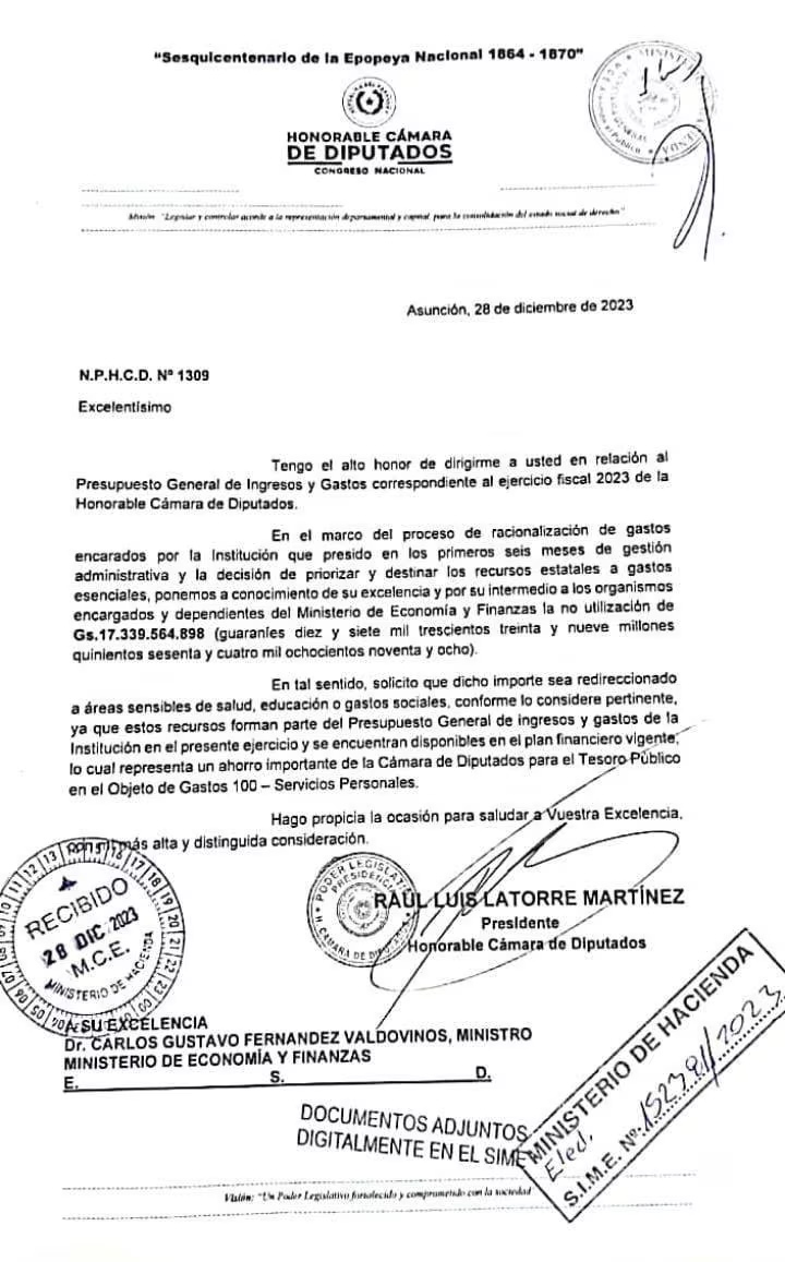 „Im Rahmen des Prozesses der Rationalisierung der Ausgaben der Institution, der ich vorstehe, und der Entscheidung, Prioritäten zu setzen (dazu zählt das Ernennen von engen Parteifreunden) und staatliche Mittel für wesentliche Ausgaben zu verwenden, informieren wir die zuständigen und vom Ministerium für Wirtschaft und Finanzen (MEF) abhängigen Stellen über die Nichtverwendung von 17.339.554.898 Guaranies“, so Latorre in einem Schreiben an den Leiter des MEF, Carlos Fernández Valdovinos. Eine Pressekonferenz vermeidet er seit zwei Wochen vehement, um unangenehmen Fragen aus dem Weg gehen zu können.
