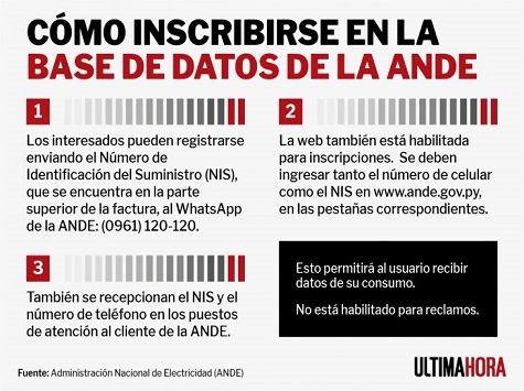 Kunden können sich registrieren lassen, indem sie ihre Versorgungs-Identifikationsnummer (NIS), die oben auf der monatlichen Rechnung steht, an die WhatsApp-Nummer des Unternehmens unter (0961) 120-120 senden. Man kann sich auch über das Internet www.ande.gov.py anmelden oder in einer ANDE-Zweigstelle die Prozedere vornehmen.