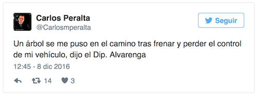 Eusebio Alvarenga, der Abgeordnete der liberalen Partei, der laut eigener Aussage „nur ein bisschen Wein mit seinen Freunden trank, bis sich ihm ein Baum in den Weg stellte“, sollte laut Abc Color heute Nacht kaum noch stehen können. Inwiefern bewegliche Bäume auf der Straße existieren, ist nicht bekannt.