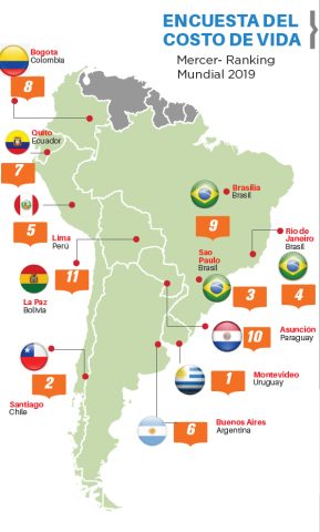 Auf südamerikanischer Ebene gilt Montevideo (70) in Uruguay als die teuerste Stadt. Ihr folgt Santiago de Chile (79) und Sao Paulo (86), die mit 28 Positionen in der Rangliste deutlich zurückfiel. An gleicher Stelle von Lima befindet sich die Stadt Rio de Janeiro (121), die auf den 99. Platz zurückfiel.