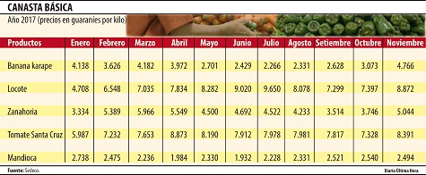 Zwischen Oktober und November 2017 stiegen die Preise für Obst und Gemüse deutlich an. Insbesondere war das deutlich bei Bananen, Orangen, Paprika, Karotten, Zwiebeln und Tomaten der Fall. Bei den Bananen stieg der Preis um 2.000 Guaranies pro Kilo. Paprika kosteten Anfang des Jahres 4.708 Gs. pro Kilo, im November waren es 8.872 Gs. Fast doppelt so teuer wie im Januar 2017.