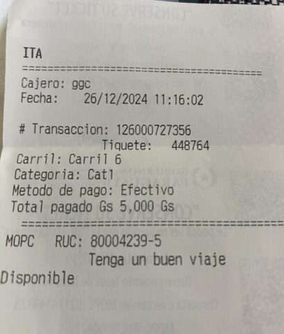 Asunción: Ein Mautticket vom 26. Dezember 2024 von der Mautstelle Itá auf der Route PY01 löst die Empörung der Bürger aus. Die scheinbar normale Transaktionsnummer 126000727356 und die Ticketnummer 448764 sind zu Symbolen wachsender Besorgnisse über den Zustand der paraguayischen Straßen und die Verwaltung öffentlicher Gelder geworden.