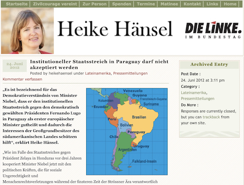 Statt Hofierung der De Facto-Regierung fordern wir die Aufklärung der Umstände, die als Anlass für den „Express Staatsstreich“ in Paraguay gedient haben. Darüber hinaus muss die Wahrung der Rechte der zivilen Opfer im Zuge des Putsches gewährleistet werden. Die von Präsident Fernando Lugo begonnene Agrarreform muss fortgesetzt und die Morde an Bauernaktivisten, wie Vidal Vega, aufgeklärt und die Todesdrohungen gegen Journalisten verfolgt werden. Ich werde heute nicht an dem Treffen mit Fernández in der deutsch-südamerikanischen Parlamentariergruppe im Bundestag teilnehmen.“