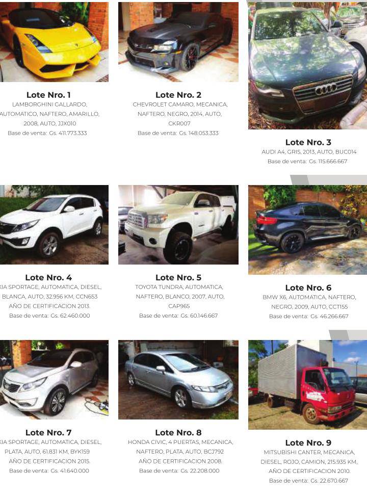 Unter anderem wird der gelbe Lamborghini Gallardo aus dem Jahr 2008 angeboten, der mindestens 411.773.333 Guaranies kosten soll. Der schwarze Chevrolet Camaro aus dem Jahr 2014 soll mindestens 148.053.333 Guaranies bringen. Weiter geht es mit einem anthrazitfarbenen Audi A4 aus dem Jahr 2013 der wenigstens 115.666.667 Guaranies in die Staatskasse spülen soll. Ebenso sind andere Fahrzeuge aus Cuchos Bestand wie Kia Sportage, Toyota Tundra, BMW X6 und andere auf der Liste derer, die recht günstig zu haben sind.