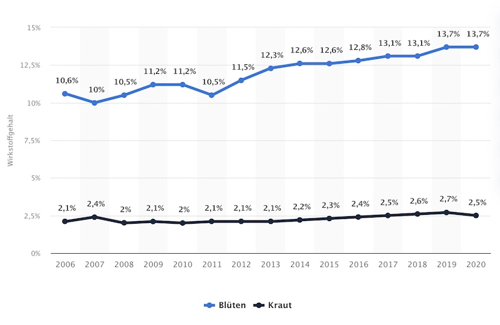 Der Gehalt des Wirkstoffs THC ist bei Marihuana in Deutschland in den letzten Jahren leicht gestiegen. War etwa bei Blüten im Jahr 2006 noch ein THC-Gehalt von etwa 10,6 Prozent im Durchschnitt üblich, lag der Wirkstoffgehalt der Droge im Jahr 2020 dagegen bei 13,7 Prozent.