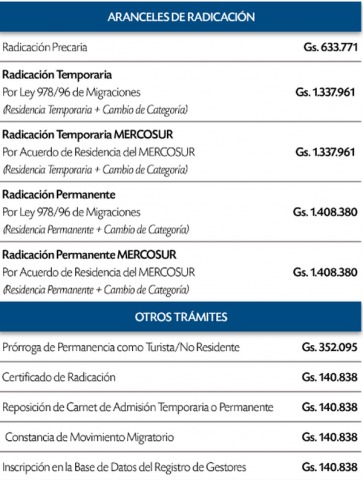 Wer einwandern will, der muss mit Kosten von mindestens 1.408.380 Guaranies rechnen, wenn er sich hier im Land dauerhaft niederlassen will. Die Verlängerung des Aufenthalts von einem Touristen, der regulär 90 Tage in Paraguay bleiben darf, kostet 352.095 Guaranies. Weitere Gebühren können Sie im eingefügten Bild ersehen.