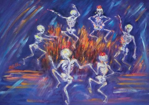 Dazu ein hübsches Foto von sechs hirnvollen Repräsentanten hiesig Eingeborenen tanzend um ihren höchst persönlich angezündeten Müll. Wieder einmal wenigstens etwas täglich zustande gebracht. Ist ja immerhin schon mal was. Die Kleinkinder wurden wohl schon zu Bettchen gebracht und konnten an der Fotosession nicht teilnehmen. Glücklicherweise lädt das Wochenblatt nicht noch ein Audiofile vom zum Abfackeln des Mülls passenden Swudi Iglesias auf 120 dB Stereoiden hoch.