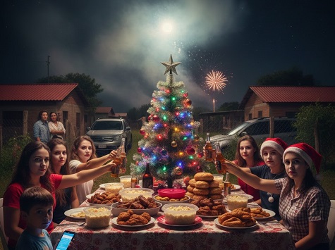 Gekrönt wird das Ganze von einem Geschenkerausch und einer Völlerei, die jegliches Maß verloren hat. Es wird konsumiert, als gäbe es kein Morgen. Die Tische biegen sich unter Bergen von Fleisch und Alkohol, während man gleichzeitig über die hohen Preise jammert. Es ist eine Orgie des Überflusses, die nahtlos in die Silvesterfeierlichkeiten übergeht.