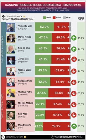 Peña musste sich hinter Politikern wie Yamandú Orsi (Uruguay, 52,9 %) und Daniel Noboa (Ecuador, 47,5 %) geschlagen geben. Dies zeigt, dass die Bürger in anderen Ländern eine wirksamere Politik anerkennen. Sogar der in Chile scharf kritisierte Gabriel Boric erreichte einen höheren Prozentsatz als der paraguayische Präsident. Unterdessen verkauft der Peña weiterhin die Idee eines “wohlhabenden Paraguay“, was jedoch nicht zu konkreten Verbesserungen für die Bevölkerung führt.