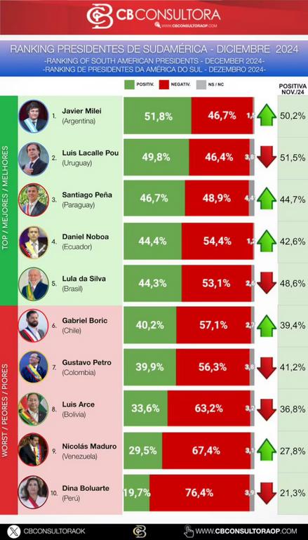 Den dritten Platz belegt dann Santiago Peña aus Paraguay in der Liste der Präsidenten mit dem besten Image in Südamerika mit 46,7 % positiver Bildwahrnehmung und 48,9 % negativer Meinung.