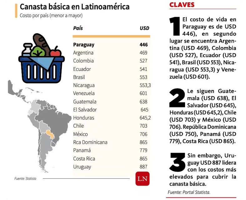 Nach Angaben des Statistikportals Statista ist Paraguay das Land mit den niedrigsten Kosten für den Grundnahrungsmittelkorb in Lateinamerika. Bei der Deckung dieser Grundbedürfnisse ist Uruguay das Land mit den höchsten Kosten.