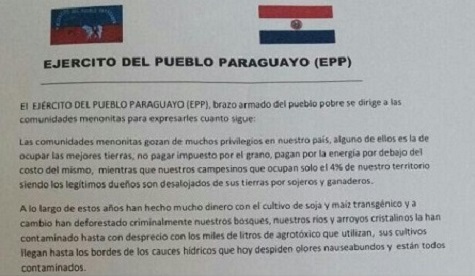 Heute wurde die zweite Anweisung der selbsternannten paraguayischen Volksarmee EPP veröffentlicht, die Franz Wiebe erhalten hatte. „Die Mennoniten haben viele Privilegien im Land. Sie besetzen Land und zahlen wenig Steuern. 4% der rechtmäßigen Bauern und Eigentümer werden von mennonitischen Sojalandwirten und Viehzüchtern vertrieben und es werden immer mehr“, lautete die Erklärung der EPP.