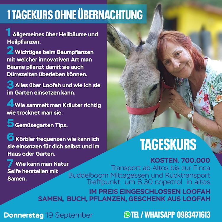 Altos: Auf der Finca Buddelboom erlernt man bei einem Tageskurs in deutscher Sprache, der nächste ist am kommenden Donnerstag den 19. September, Allgemeines über Heilpflanzen, über das Pflanzen von Bäumen, alles über Loofah und wie man ihn richtig einsetzt und wie man Seife herstellen kann.