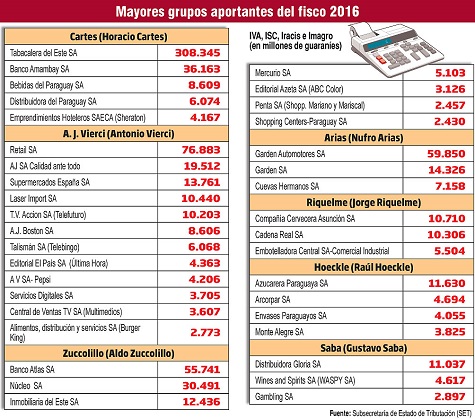 Asunción: Die Konzerne der Cartes, Vierci und Zuccolillo Gruppe sind an der Spitze in Paraguay, die die meisten Beiträge der Mehrwertsteuer und anderer Abgaben abführen. Einige Supermarktketten folgen dem Trio.