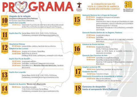 Der Besuch von der Reliquie in Paraguay ist etwas ganz besonderes, vor allem weil das Land als “das Land des Herzens in Südamerika gilt“. Das Motto, das von den Kapuzinern bezüglich des Herzens von San Pio herausgegeben wurde heißt: “Das Herz von St. Pio besucht das Herz von Amerika und möchte Sie treffen“.