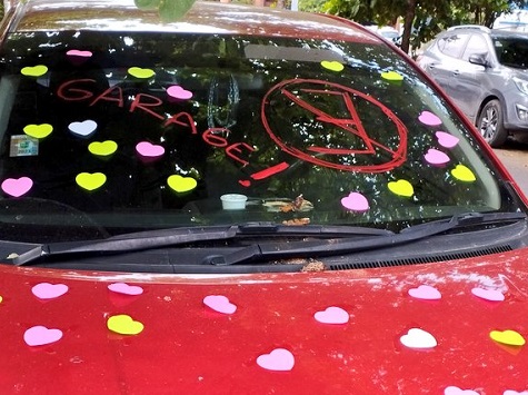 Als Reaktion auf die Tat der Verantwortungslosigkeit platzierte die betroffene Frau mehrere Aufkleber mit an die verantwortungslose Person gerichteten Botschaften und unzähligen gelben sowie hellblauen Herzen auf dem gesamten Auto.