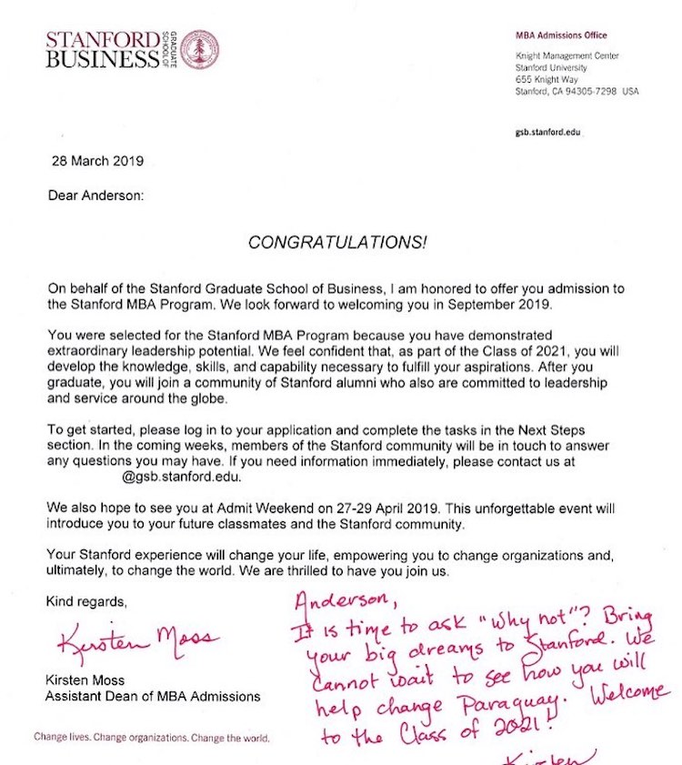 “Wir können es nicht erwarten zu sehen, wie du Paraguay änderst“, wurde ihm von von Kirsten Moss, Assistent Dean of MBA Admissions mitgeteilt.