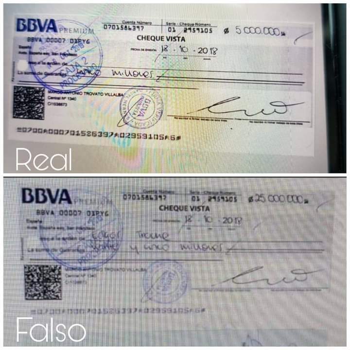 Doch dann kam Marco Trovato mit dem originalen Scheck herum, der aus dem Banksystem gerettet werden konnte. Darauf war zu erkennen, dass dieser nur über 5 Millionen Guaranies ausgestellt und auch der Name Edgar Troche erst nachträglich eingefügt wurde.