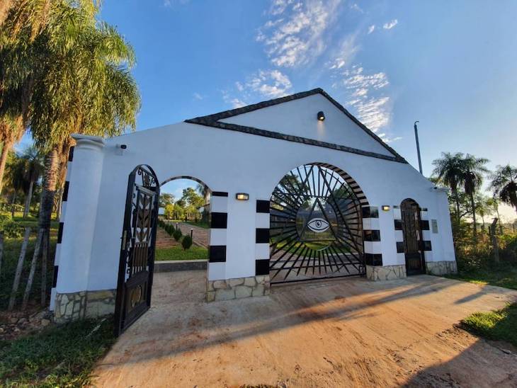 Caacupé: Eine riesige Darstellung des Auges der Vorsehung, auch bekannt als “Das Auge, das alles sieht“, schmückt das Eingangsportal zur Residenz des deutschen Staatsbürgers Joachim Späh im Stadtteil San Francisco in Atyrá an der Grenze zum Ortsteil Cabañas von Caacupé, die gestern von der Staatsanwaltschaft auf der Suche nach dem Mädchen Juliette durchsucht wurde, das seit mehr als einem Monat vermisst wird.