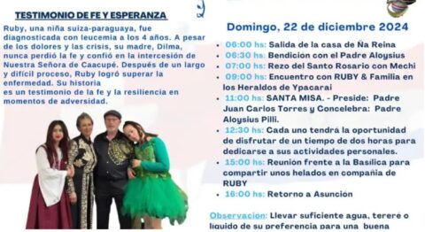 Die Familie plant, an diesem Sonntag, dem 22. Dezember, die Jungfrau von Caacupé zu besuchen und sie mit den Menschen zu teilen, die sie kennenlernen möchten. Die Angehörigen des geheilten Kindes bezahlen den Transfer von Asunción nach Caacupé sowie wieder zurück. Auch zu einem Eisessen sind die Teilnehmer eingeladen. Weitere Einzelheiten entnehmen Sie bitte aus dem eingefügten Flyer.