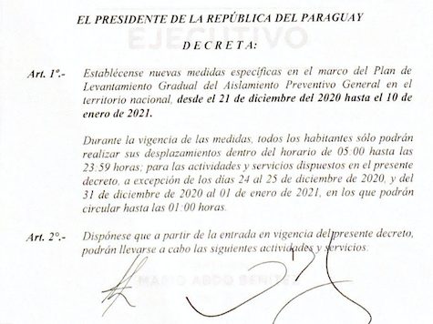 Asunción: Das vom Präsident unterzeichnete Dekret N° 4.525 zu den kommenden Restriktionen wurde veröffentlicht. Es gilt ab dem 21. Dezember bis zum 10. Januar 2021. Erlaubt sind Treffen bis zu 12 Personen und Bewegungsfreiheit an Feiertagen bis 01:00 Uhr nachts.