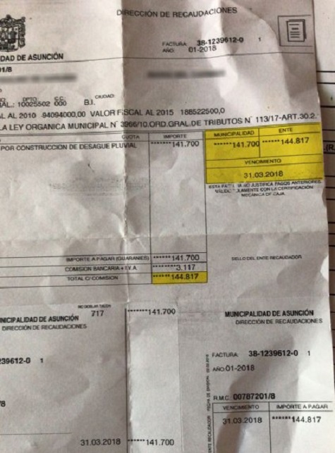 Ludovico Sarubbi, Ex-Direktor von dem staatlichen Wasserversorger Essap und Bewohner von Sajonia, berichtete, dass er eine Rechnung von der Stadtverwaltung in Asunción erhalten habe. Darin sei eine Forderung über 144.817 Guaranies enthalten mit dem Begriff “Konstruktion eines privaten Gully-Abwassersystem“, ohne nähere Beschreibung, wofür eigentlich dieses Projekt vorgesehen sei, wann es errichtet werde und wofür es eigentlich nützlich sei.