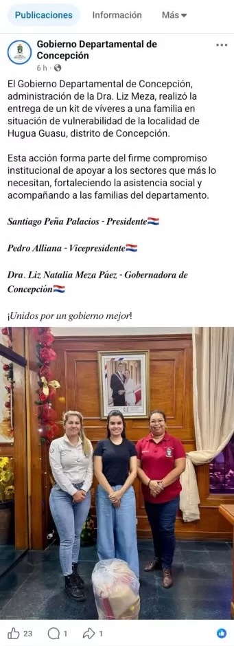 Concepción: Eine offizielle Veröffentlichung der Departementsverwaltung von Concepción geriet in den sozialen Netzwerken in heftige Kontroversen, nachdem sie unter der Leitung der Gouverneurin Liz Meza, die HC angehört, mit Nachdruck die Übergabe eines einzigen Lebensmittelpakets an eine bedürftige Familie in der Ortschaft Hugua Guasu bekannt gegeben hatte.