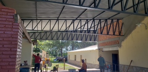 Die Vorarbeiten für das Projekt liefen schon seit einigen Wochen. Nachdem die Maurer ihre Tätigkeiten beendet hatten, wurden Eisenträger eingesetzt, um das Blechdach montieren zu können. Auch diese Tätigkeit erfolgte durch freiwillige Helfer aus der Kolonie.