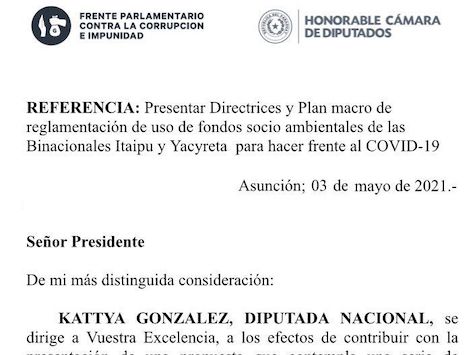 Asunción: Die Abgeordnete Kattya González veröffentlichte ein Dokument in den sozialen Netzwerken, dass an die Regierung gerichtet ist und einige Richtlinien für die Regulierung des Gesetzes N° 6.729/21 vorschlägt, welches die Sozialmittel aus Itaipú und Yacyretá verteilt.