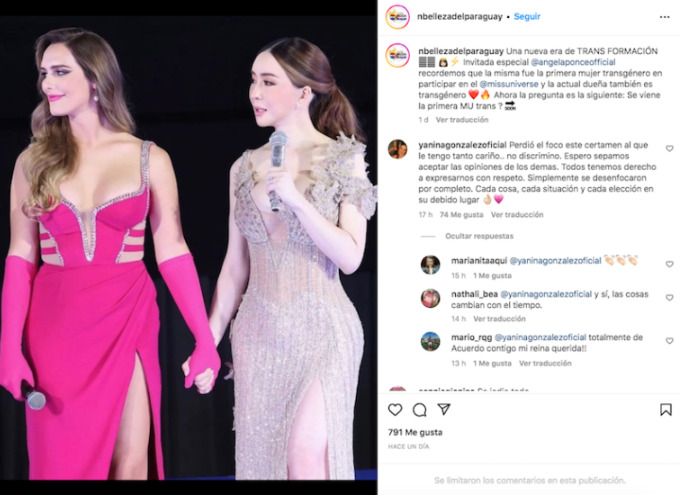 Unter den Kommentaren sticht der von González (Beitragsbild) hervor, Vertreterin von Paraguay vor der Wahl zur Miss Universe im Jahr 2004, die sich erneut gegen die Teilnahme von Transfrauen an Schönheitswettbewerben aussprach, aber betonte, dass ihre Kritik “keine Diskriminierung darstellt“.