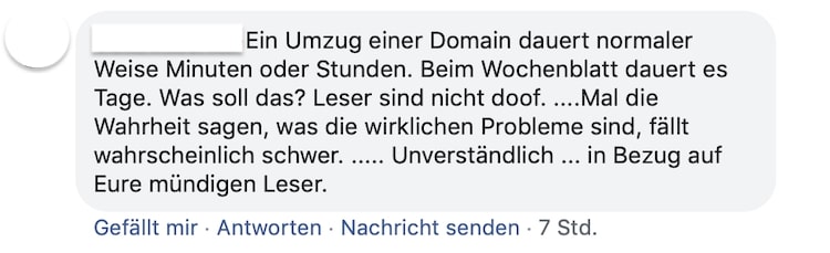 Dieser Kommentator vom Facebock könnte natürlich schon mal seine drei statischen Internetseiten von der Datensicherung innerhalb Minuten bis Stunden zum neuen Provider übertragen haben und dazu noch ne info-Emehl-Adresse konfiguriert haben. Ich denke, beim Wochenblatt hängt noch ne Steintafel hinten dran, welche extra mit dem Lastwagen zum neuen Provider geliefert werden musste.