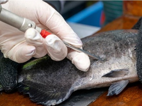 Der Chip wird unter die Haut im Bauch des Fisches eingesetzt und hält unbegrenzt.