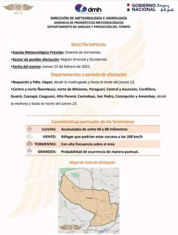 Während die Departements Ñeembucú, Misiones, Paraguari, Central mit Asunción, Cordillera, Guairá, Caazapá, Caaguazú, Alto Paraná, Canindeyú, San Pedro, Concepción und Amambay ab Donnerstagmittag bis Donnerstagnacht von der Schlechtwetterfront beeinflusst werden.