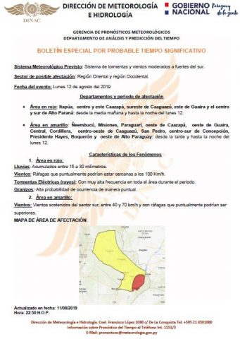 Ebenso würde die “gelbe“ Zone die Departements Ñeembucú, Misiones, Paraguarí, den Osten von Caazapá, den Osten von Guairá, Central, Cordillera, Caaguazú, San Pedro, Concepción, Presidente Hayes, Boquerón und den Osten von Alto Paraguay betreffen. Die Sturmfront würde diese Gebiete am heutigen Nachmittag und Abend erreichen.