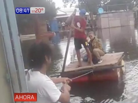Asunción: Not macht erfinderisch, vor allem wegen dem Hochwasser. Betroffenen aus dem Bañado Norte mussten auf ein prekäres Floß aus Fässern und Sperrholz zurückgreifen, um ärztliche Hilfe zu erlangen.