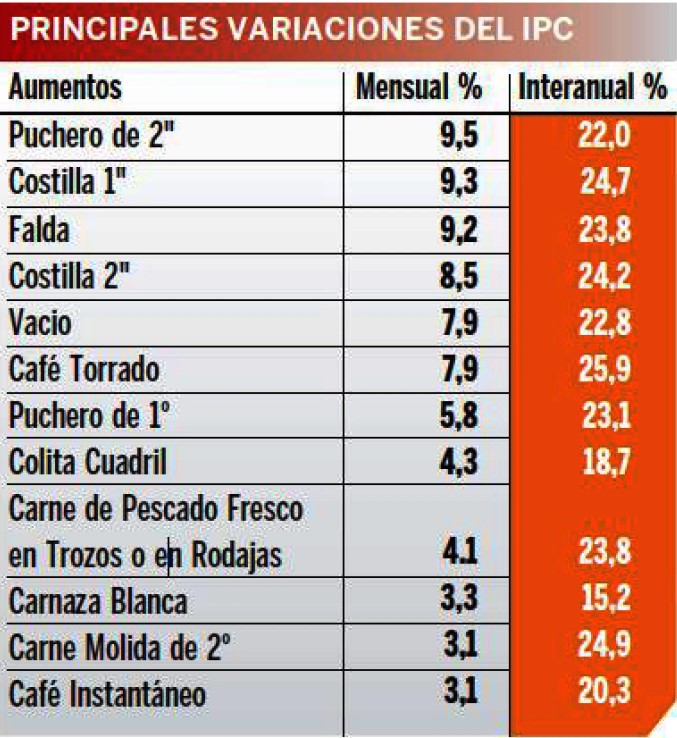 Zu den größten Preissteigerungen bei Lebensmitteln zählt Fleisch: Rindfleisch zweiter Klasse verteuerte sich im Mai um 9,5 Prozent und hat in den letzten zwölf Monaten bereits um 22 Prozent zugelegt; Die Rinderrippe verteuerte sich im letzten Monat um 9,3 Prozent und im Jahresvergleich um 24,7 Prozent.