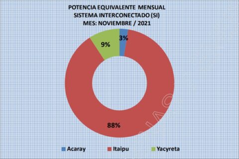 Paraguay deckt seinen Strombedarf zu 100 % durch Wasserkraft, die hauptsächlich vom Kraftwerk Itaipú und in geringerem Maße von den Kraftwerken Yacyretá und Acaray geliefert wird, wie die folgende Grafik mit den Daten für den Monat November zeigt.
