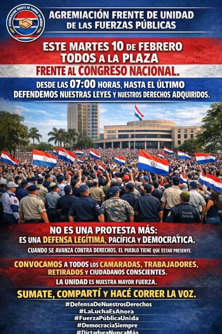 Asunción: Die Vereinigung „Frente de Unidad de las Fuerzas Públicas“ hat für diesen Dienstag eine Mobilisierung vor dem Nationalkongress angekündigt, zeitgleich mit der legislativen Debatte über die Reform der Staatskasse. Der Sektor betont, dass die Initiative unter seinen Mitgliedern große Besorgnis über die möglichen Auswirkungen auf ihre Sondergesetze und erworbenen Rechte auslöst.