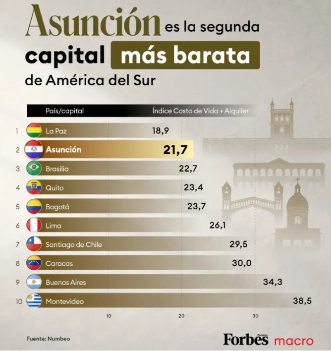 Im direkten Vergleich bedeutet das Leben in Asunción signifikant niedrigere Kosten gegenüber den anderen Hauptstädten des Cono Sur. Dieser Unterschied wirkt sich sowohl auf das Haushaltsbudget als auch auf die Lohn- und operative Wettbewerbsfähigkeit von Unternehmen aus.