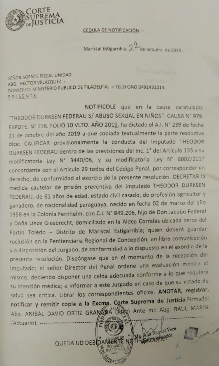 Der verheiratete Dürksen ist Landwirt und lebt in der Nähe von Fortín Toledo im Distrikt Mariscal Estigarribia. Staatsanwalt Hector Velazquez untersucht den Fall und ob es eventuell früher vergleichbare Fälle gegeben hat, die noch nicht ans Licht kamen. Ebenso kam es zu einer Anzeige bei der Coden, der Kinderhilfsstelle der Stadtverwaltung.