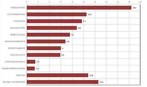 Auf die Frage wer als ANR Politiker Kandidat am besten geeignet wäre, antworteten die Befragten: 24% für Enrique Riera, 11,3% für Juan Afara, 9,7% für Pedro Alliana, 6,1% für Hugo Velazquez und 2,5% für Luis Gneiting.