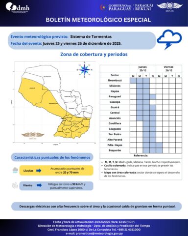 Asunción: Während die Vorbereitungen für das Fest laufen, hat die Wetterbehörde DINAC eine dringende Sondermeldung herausgegeben. Da es in den letzten Tagen bereits viel geregnet hat, trifft die neue Gewitterfront auf extrem gesättigte Böden, was das Risiko für Überschwemmungen und Sturmschäden massiv erhöht.
