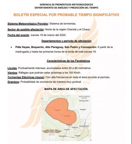Die Unwetterfront soll am Vormittag das Zentrum und den Süden des paraguayischen Chacos beeinflussen. Das Fortschreiten einer schwachen Kaltfront, der hohe Feuchtigkeitsgehalt und die atmosphärische Dynamik würden weiterhin die Bildung von Regen, Gewittern und Stürmen im ganzen Land begünstigen.