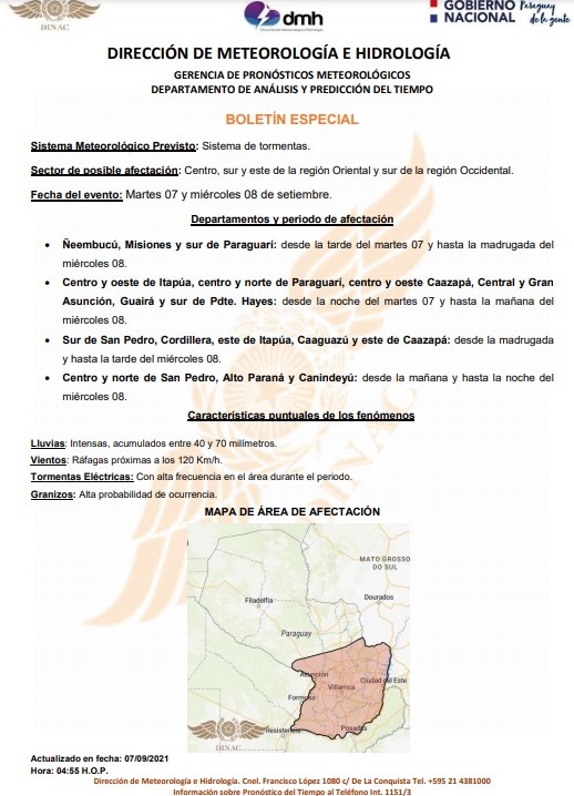 Der Himmel ist heute teilweise bewölkt, es weht mäßiger Wind aus Norden, so die Direktion für Meteorologie. Am Nachmittag sollen die ersten schweren Wetterphänomene eintreten, die zuerst den Süden des Landes betreffen und dann in der Nacht auch die Hauptstadt von Paraguay erfassen.