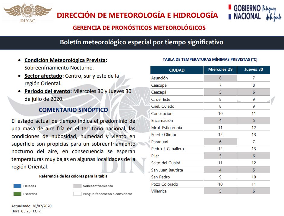 Am Morgen gab die Meteorologiebehörde eine Unwetterwarnung heraus, die Itapúa, Misiones, Paraguarí, Central und Ñeembucú betrifft. In diesen Departements kann es zu Starkregen, schweren Gewittern, Sturm und vereinzelt Hagelschlag kommen.