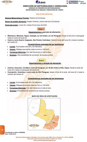 Andererseits soll ab heute, Montag, dem 2. Mai, dem Tag des Nationalfeiertags, verstärkt kalte Luft ins Land strömen, was den Temperaturrückgang in der kommenden Woche begünstigen würde. Die Temperaturen in der Nacht, für Asunción vorhergesagt, liegen dann nur noch bei rund 10 °C. Tagsüber werden maximal 24 °C erreicht. In den südlichen Landesteilen könnten die Werte noch niedriger ausfallen.