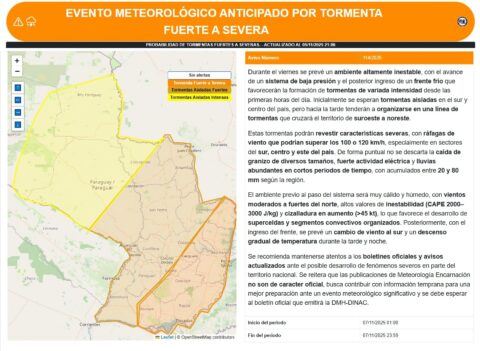 Empfehlungen der Behörden: Es wird dringend empfohlen, die offiziellen Bulletin- und aktualisierten Warnmeldungen des nationalen Dienstes zu verfolgen. Werden Veröffentlichungen von externen Stellen – wie in Encarnación – gesehen, die keinen offiziellen Charakter haben, sollte man stattdessen die frühzeitige offizielle Warnung der DIMH-DINAC (Nationale Direktion für Meteorologie und Hydrologie) konsultieren, um sich bestmöglich auf das Wetterereignis vorzubereiten.