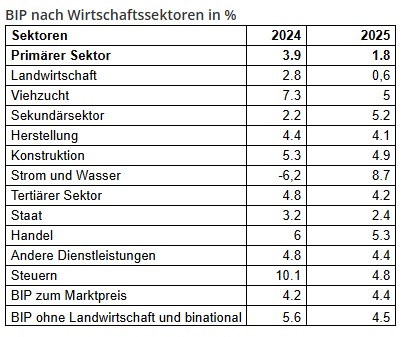 Auch im Bausektor ist eine deutliche Dynamik zu beobachten, hier wird ein Wachstum von 4,9 % erwartet, und im Industriesektor wird ein Anstieg von 4,1 % prognostiziert. Ein wesentlicher Faktor ist das prognostizierte Wirtschaftswachstum, ohne Berücksichtigung des Agrarsektors und binationaler Unternehmen.